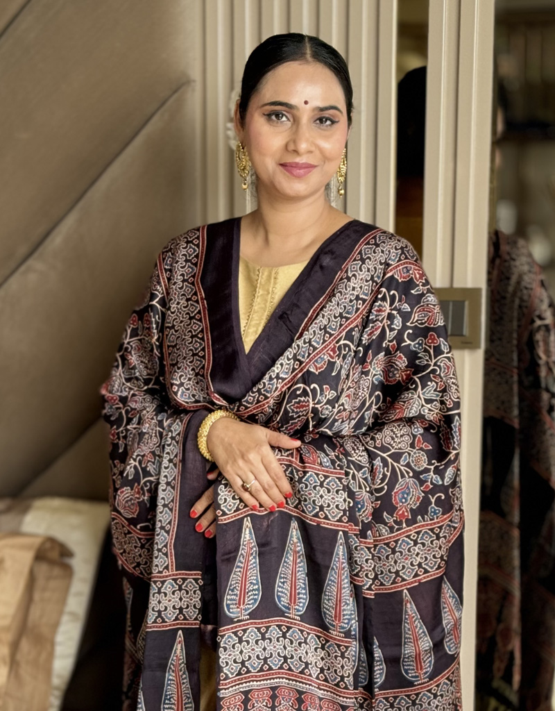 This exquisite beautiful Modal silk Dupatta showcasing the adorable Ajrakh pattern. Crafted with utmost care, this Dupatta is showing the intricate art of Ajrakh printing, a traditional technic from the Kutch region, Gujarat. Ajrakh printing is an ancient craft that involves block printing using natural dyes, including Indigo, Madder and other plant based colors. The Dupattas are handmade and fabric passes through several processes.