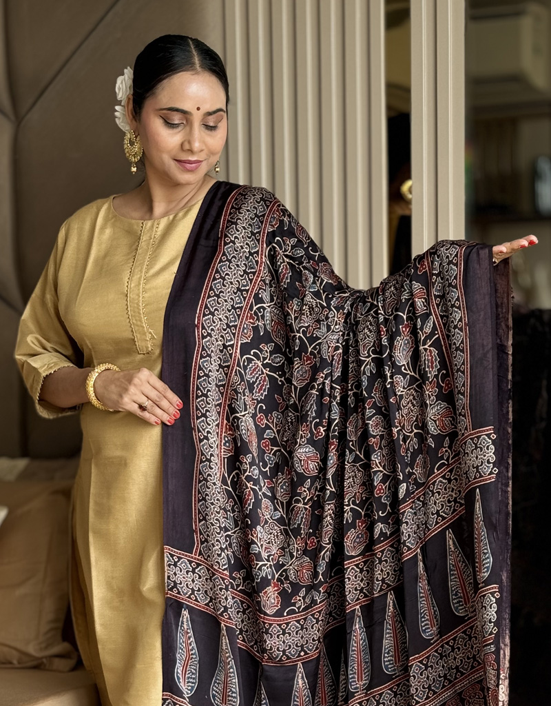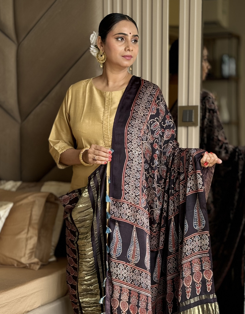 Ajrakh Modal Golden Border Bel Print Dupatta – Black
