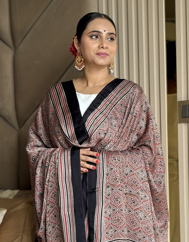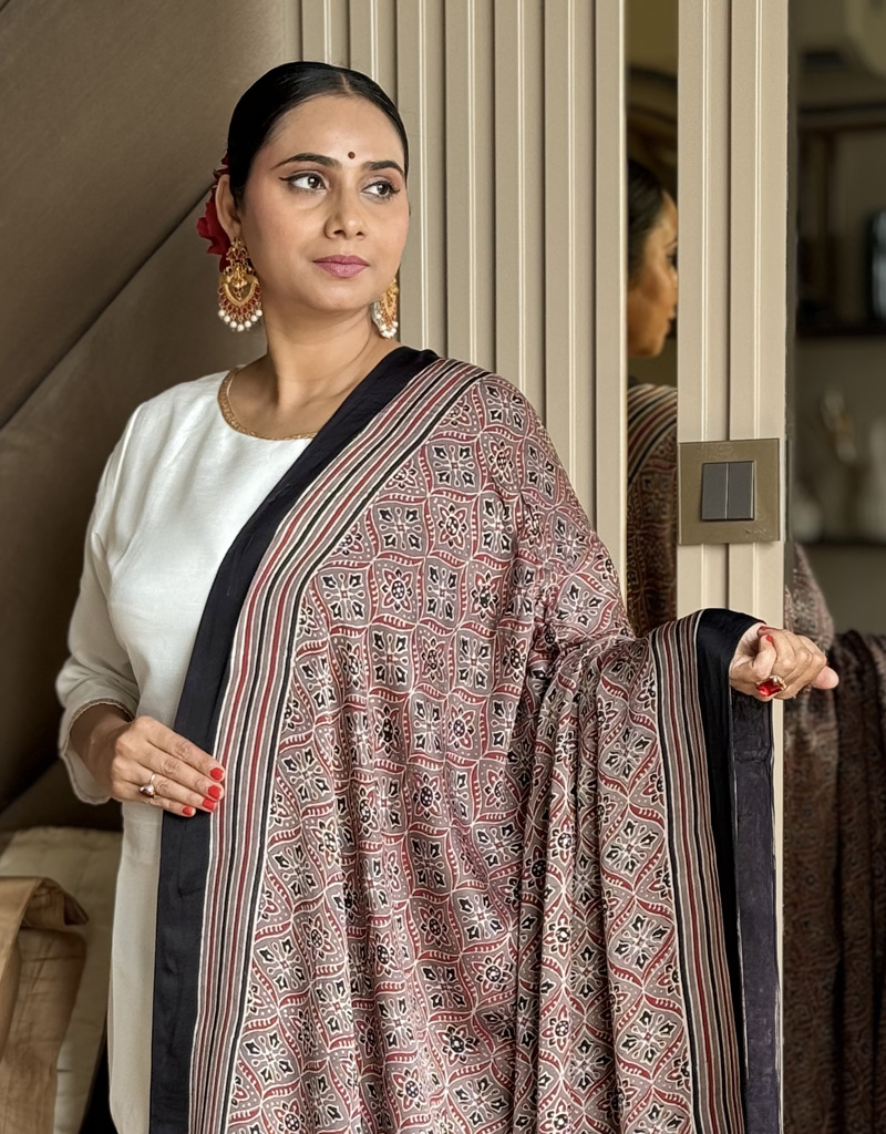 This exquisite beautiful Modal silk Dupatta showcasing the adorable Ajrakh pattern. Crafted with utmost care, this Dupatta is showing the intricate art of Ajrakh printing, a traditional technique from the Kutch region, Gujarat. Ajrakh printing is an ancient craft that involves block printing using natural dyes, including Indigo, Madder and other plant based colors. The Dupattas are handmade and fabric passes through several processes.