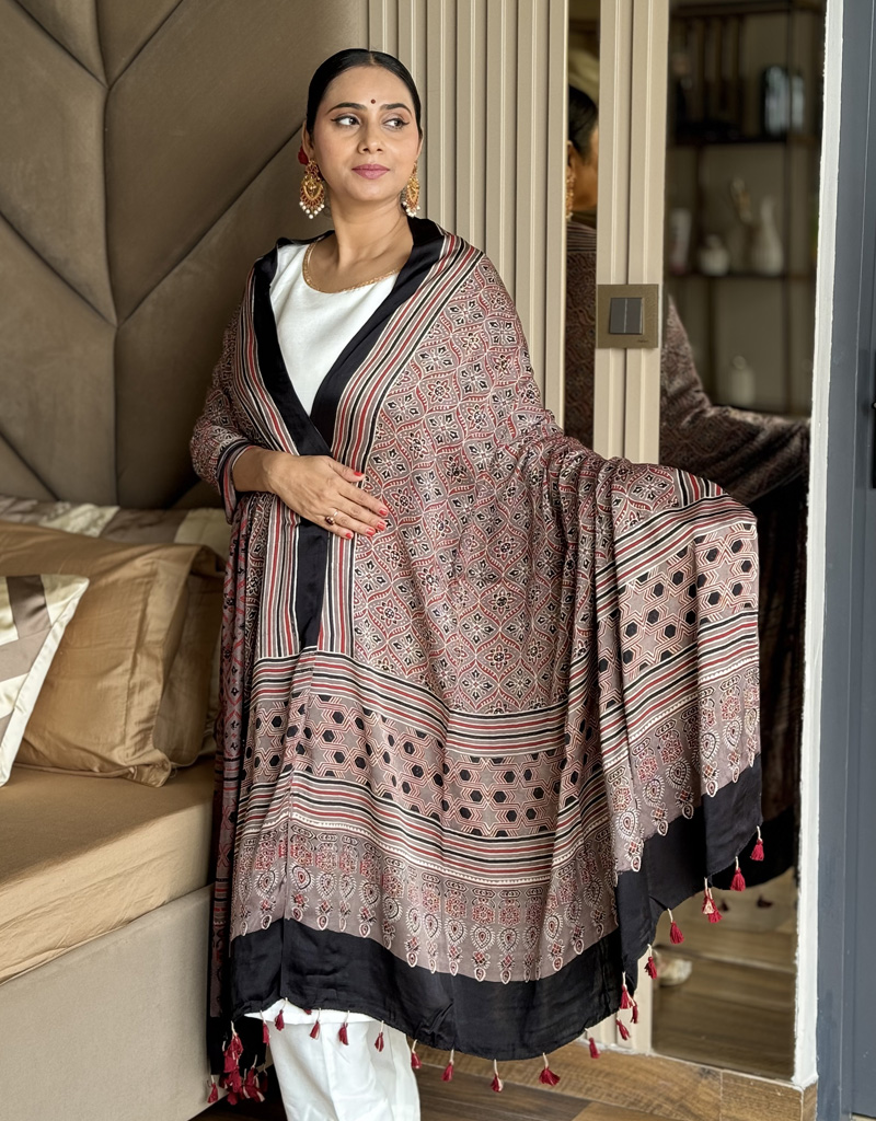 The Ajrakh Dupattas are prized for their elegance and sustainability. They are versatile and can be paired ethnic wear, semi- formal and popular choice for festive occasions or casual styling. Their eco-friendly nature and cultural significance make them a timeless addition to any wardrobe. The tassels add a playful touch to this elegant accessory.