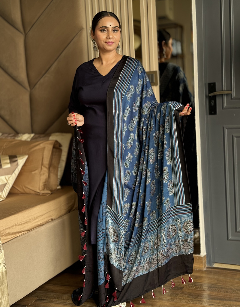 The Ajrakh Dupattas are prized for their elegance and sustainability. They are versatile and can be paired ethnic wear, semi- formal and popular choice for festive occasions or casual styling. Their eco-friendly nature and cultural significance make them a timeless addition to any wardrobe. The tassels add a playful touch to this elegant accessory.