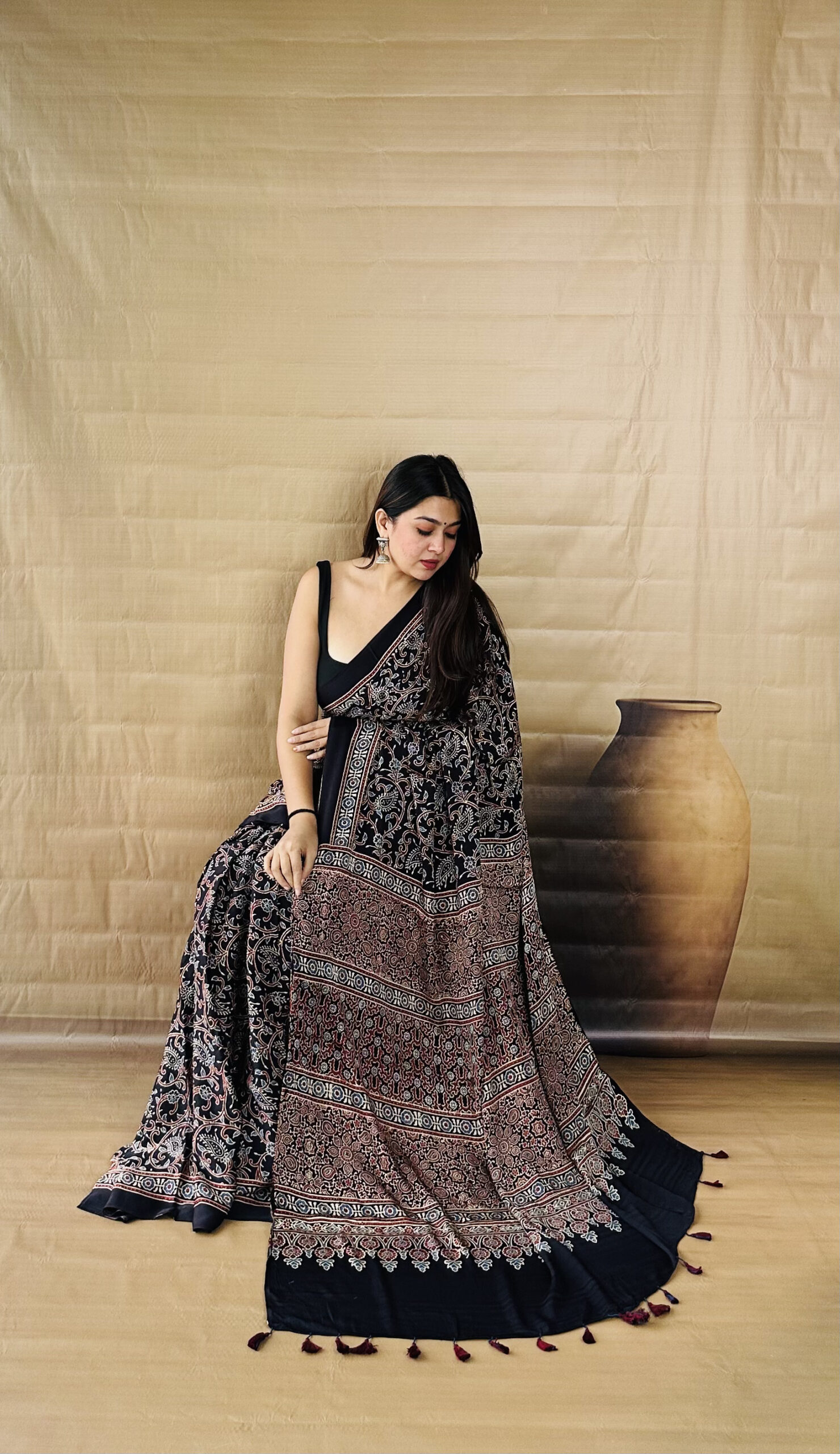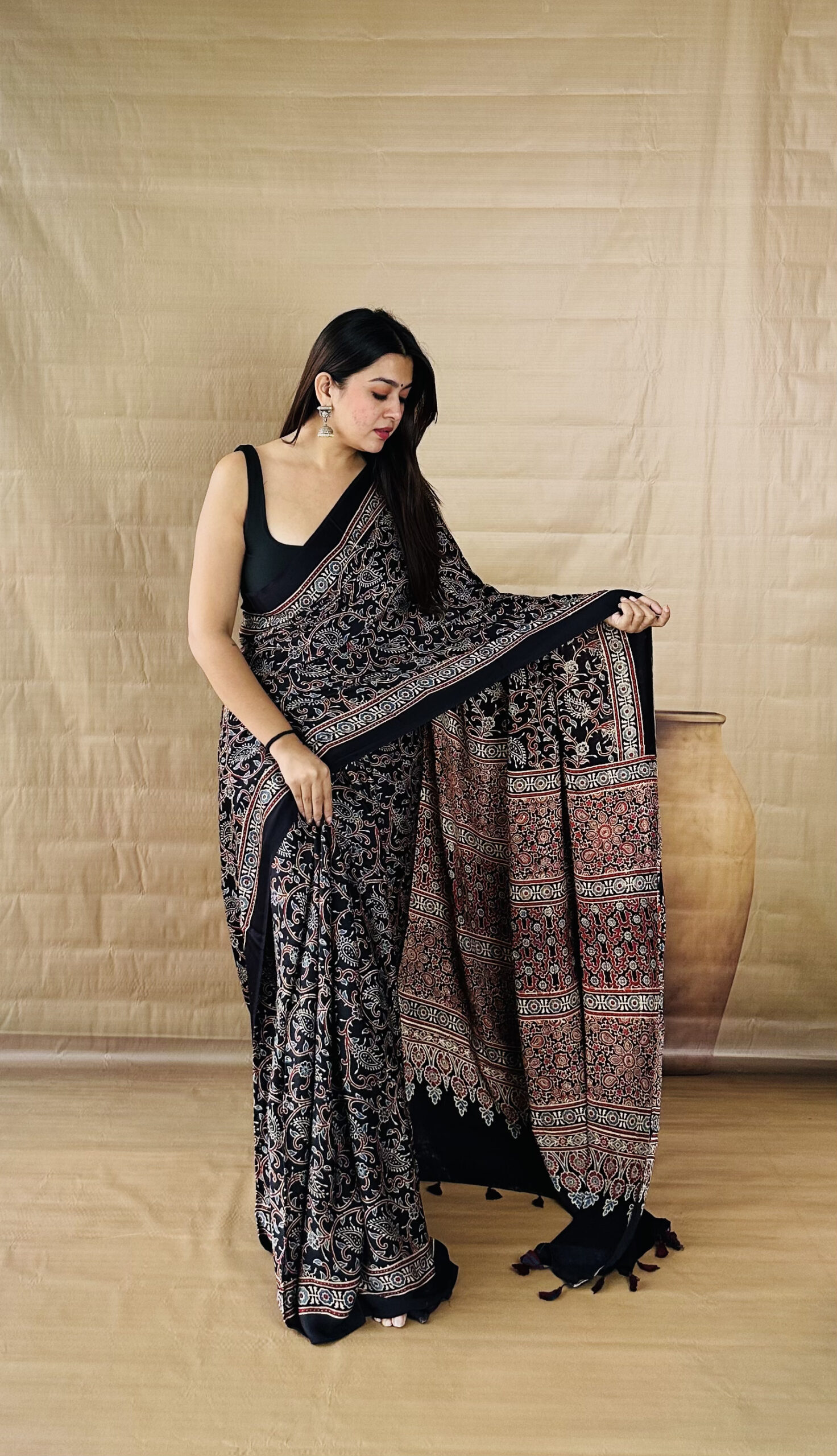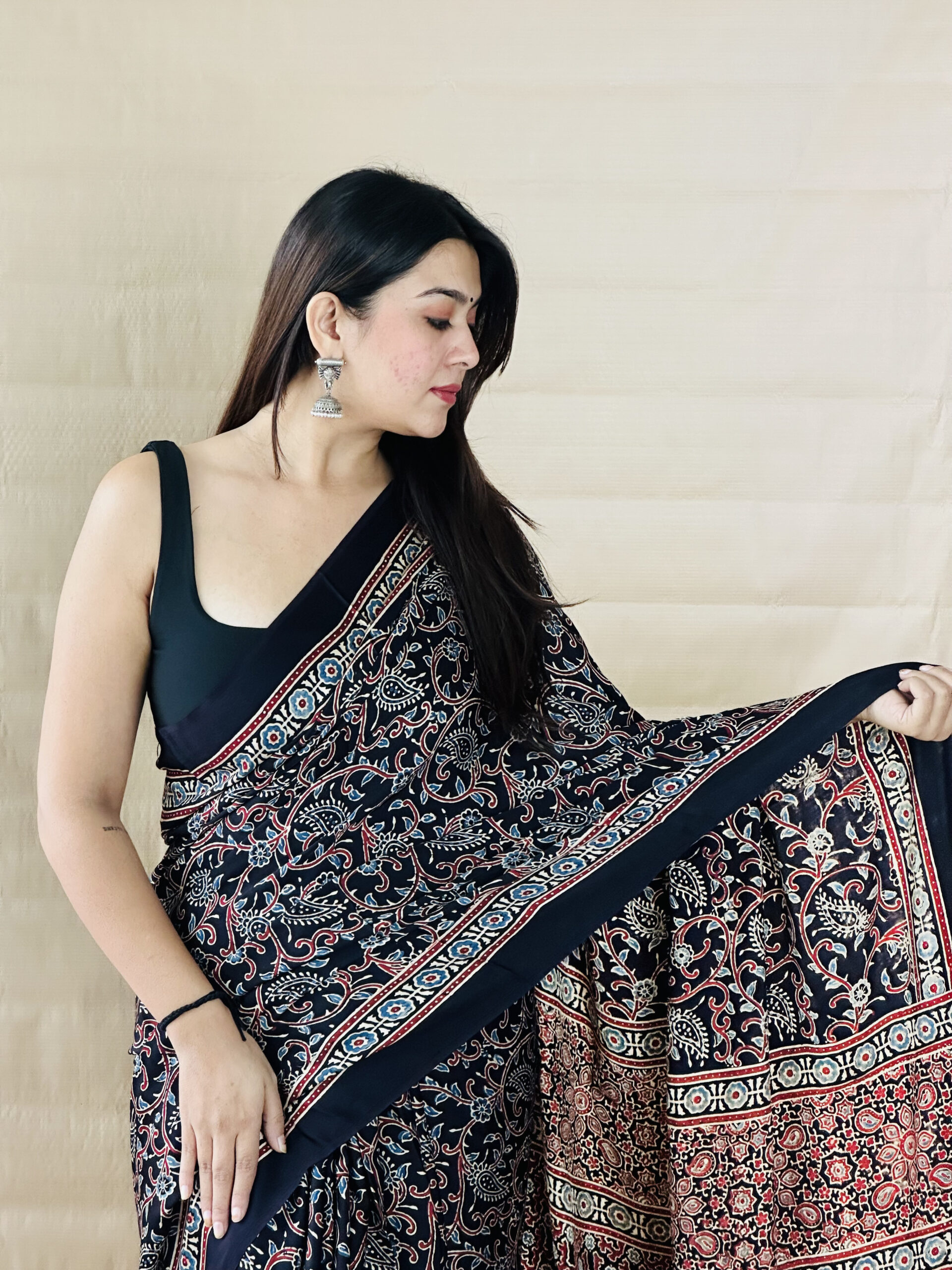 Black Color Jaal Print Ajrakh Modal Silk Saree