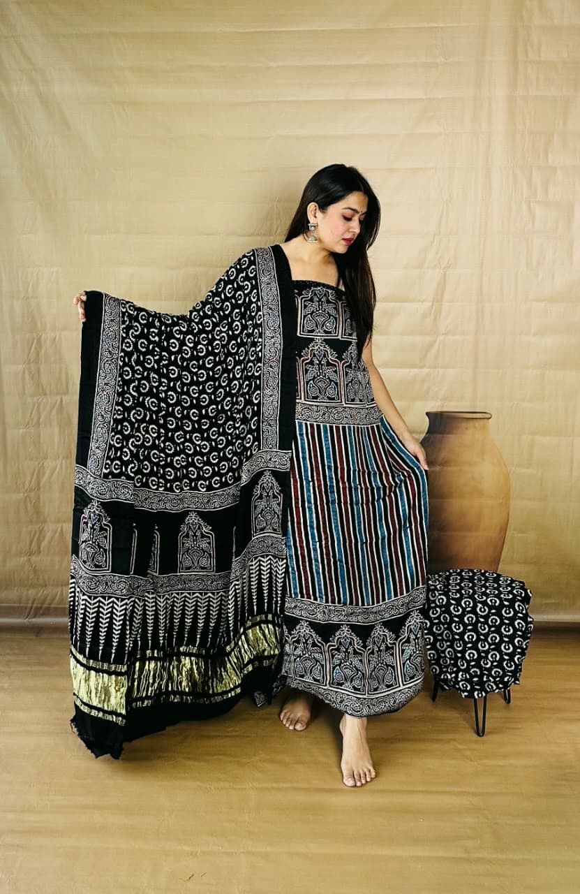 The stunning Black base decorated with intricate Grey Ajrakh- style motifs, bringing a perfect blend of tradition and contemporary charm. The top features detailed geometric and block- style pattern, giving it a bold yet graceful visual appeal. The bottom complements it with vertical multicolor stripes and coordinated architectural- style border. Completing the look is a beautifully crafted dupatta filled with all over circular motifs and striking patterned border, trying every element together with effortless sophistication.