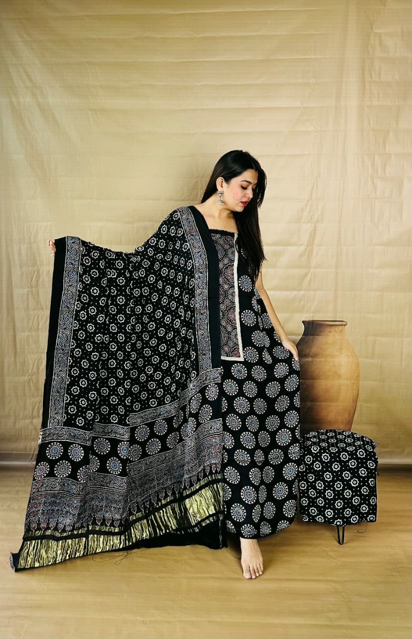 Crafted in luxurious Pure Modal Silk, this set showcases artistry in sophisticated circular motifs that stand out beautifully against deep Black base. The fabric glides smoothly with an elegant, weightless fall, offering a polished look without compromising comfort. Intricately carved borders and meticulously arranged patterns lend a couture- like finish, making it an excellent choice for tailored suits, contemporary silhouettes, or statement ethnic wear designed for upscale gatherings and refined occasion.