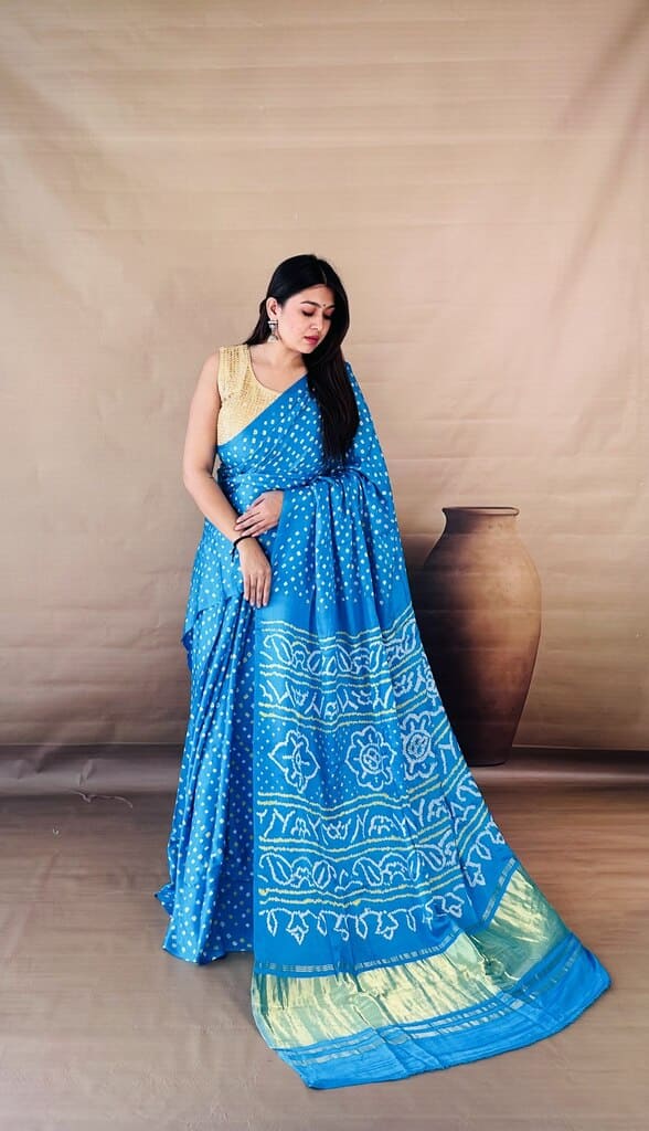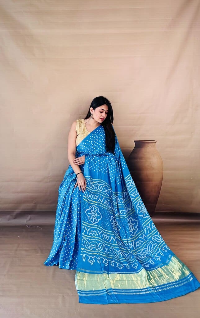 Capture the serenity of a clear sky with our Cerulean Sky Bandhani Saree, a piece that radiates freshness and poise. This bright azure drape is covered in a delicate field of white dots, transitioning into a highly detailed pallu featuring traditional floral and wave-like geometric motifs. The design is elegantly anchored by a substantial gold tissue border, adding a touch of golden-hour glow to the cool blue palette. The high-quality fabric ensures a crisp drape while maintaining a soft, comfortable feel against the skin. Pair this piece with a contrasting gold sleeveless blouse and minimal jewelry for a look of modern, effortless elegance.