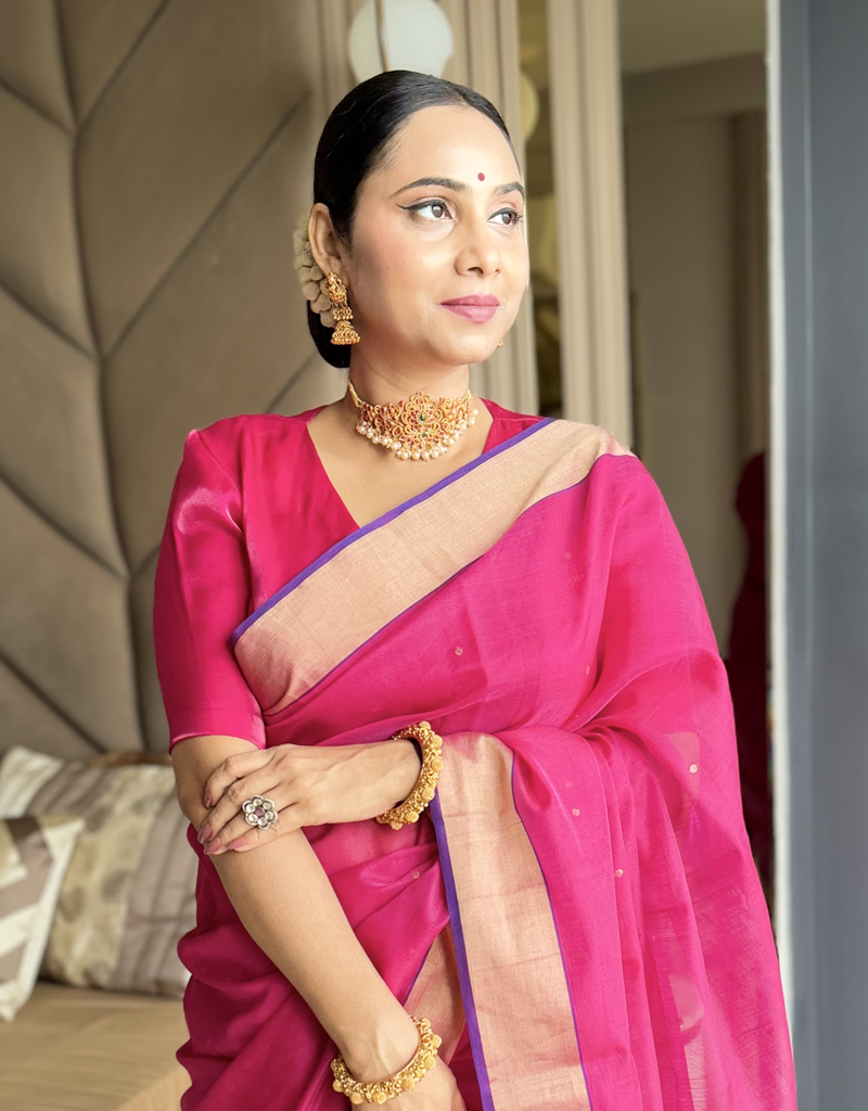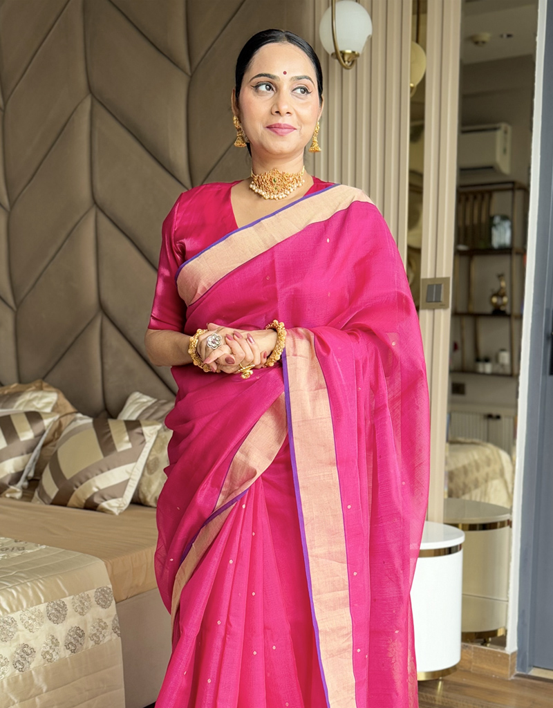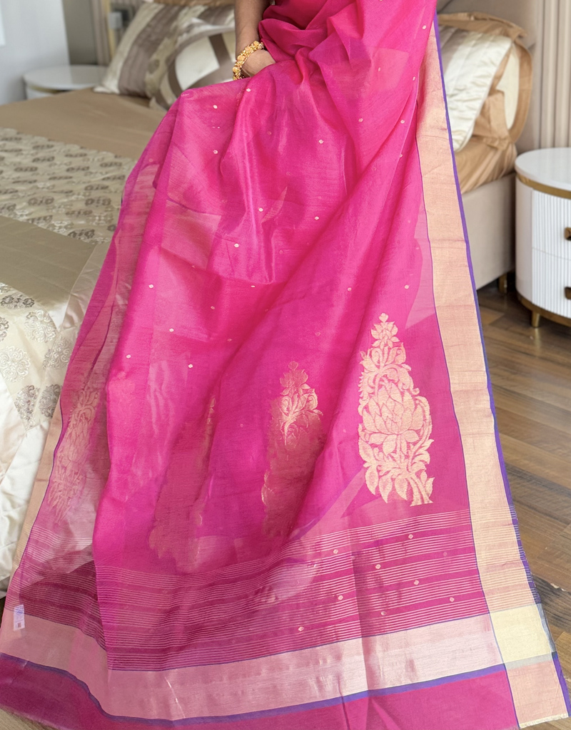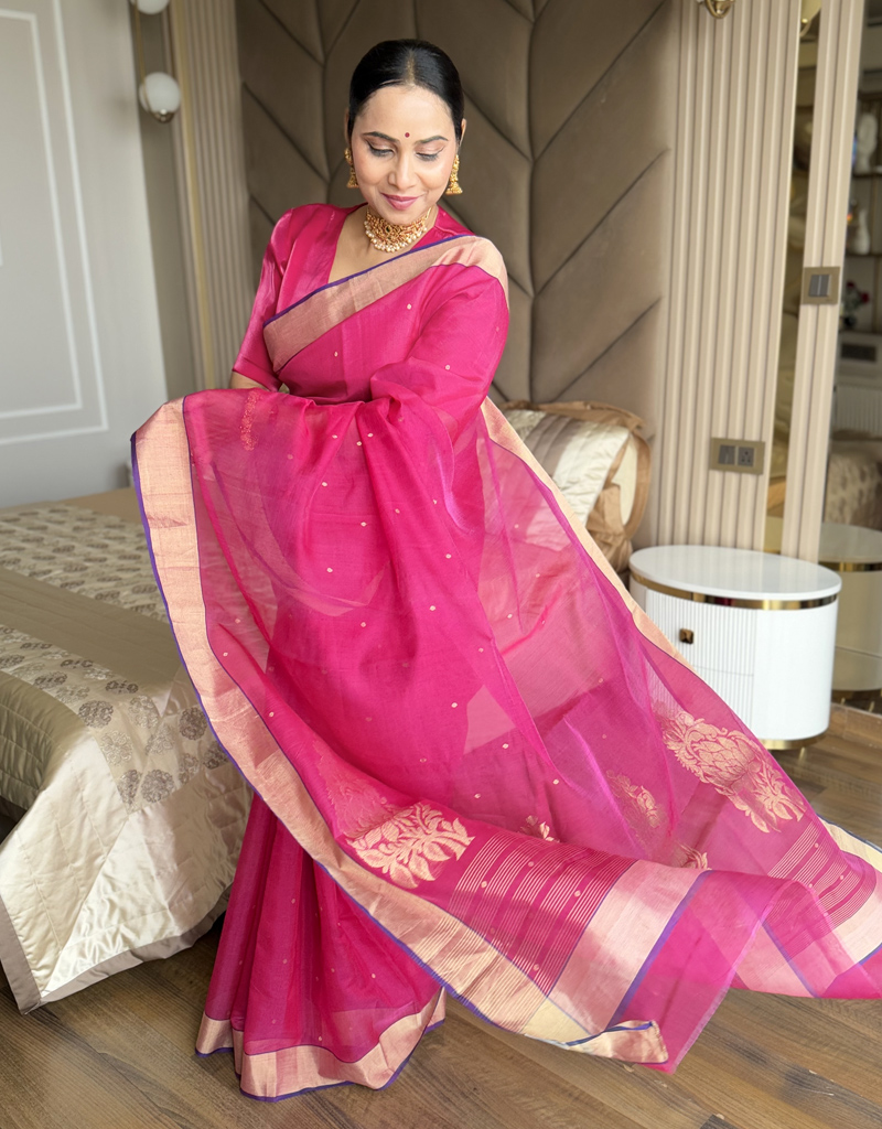 Color from the Nature Palette in Chanderi Saree reminds us of wedding days and Festivals. Chanderi fabric has a very good luster and is ever in trend. This Punch Pink color suits well in day function then evening. Beautiful Dots in zari woven all over the saree. Saree has a simple border. You can wear some brocade design blouses to enhance the look of the saree.