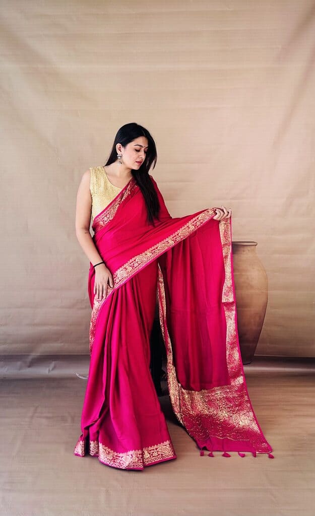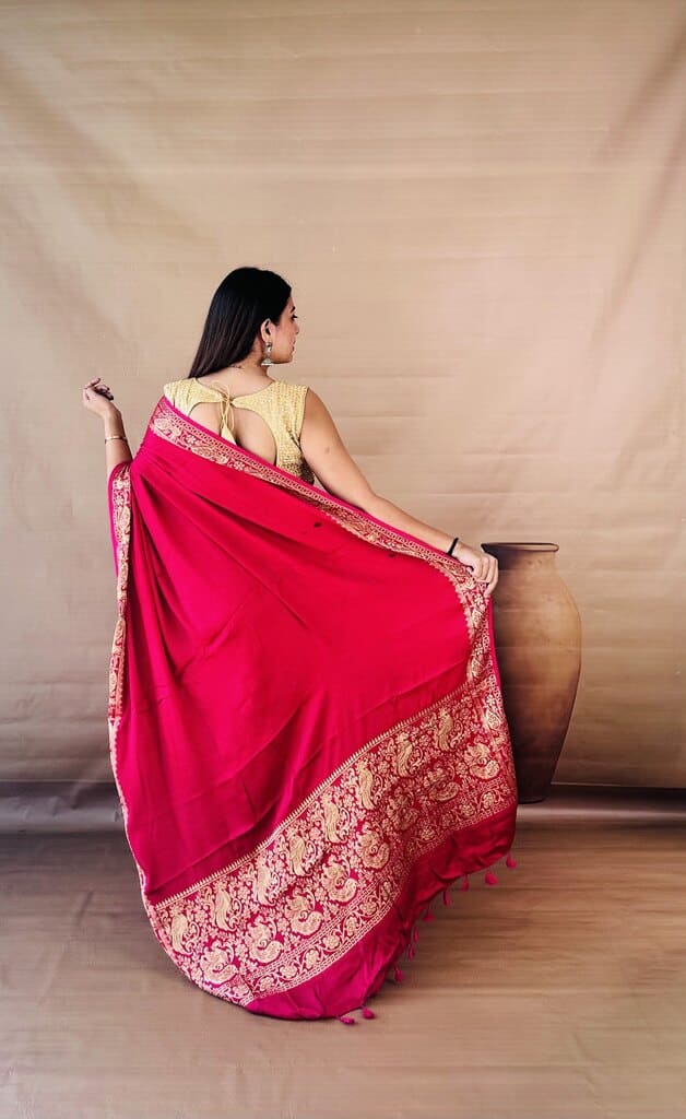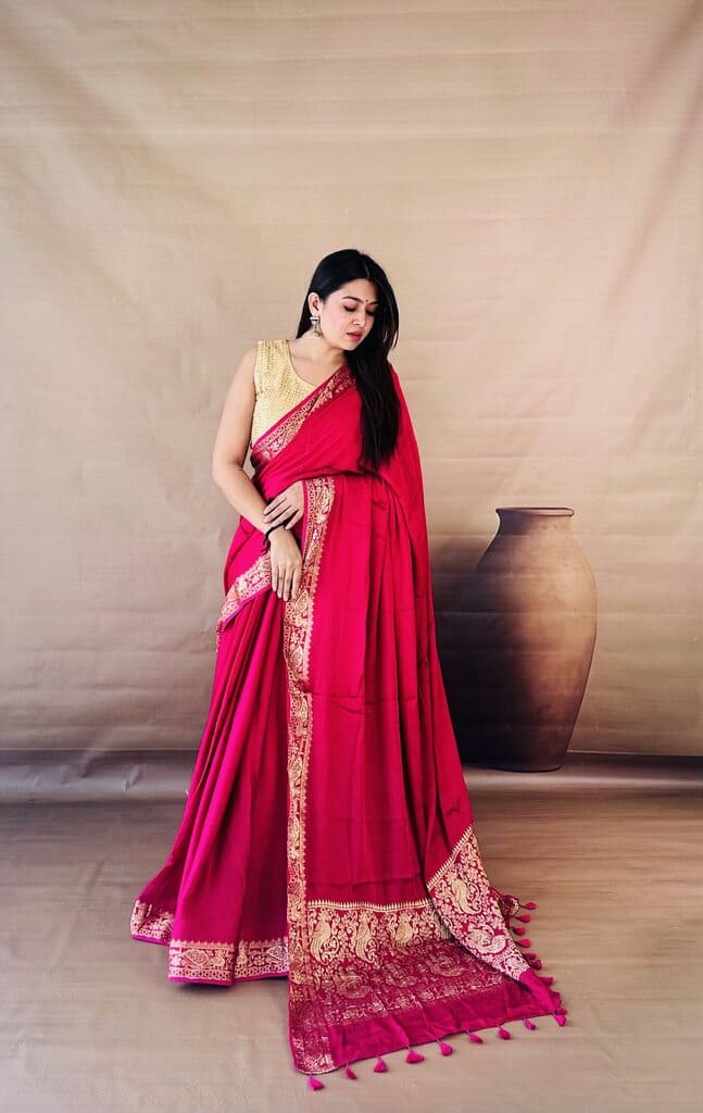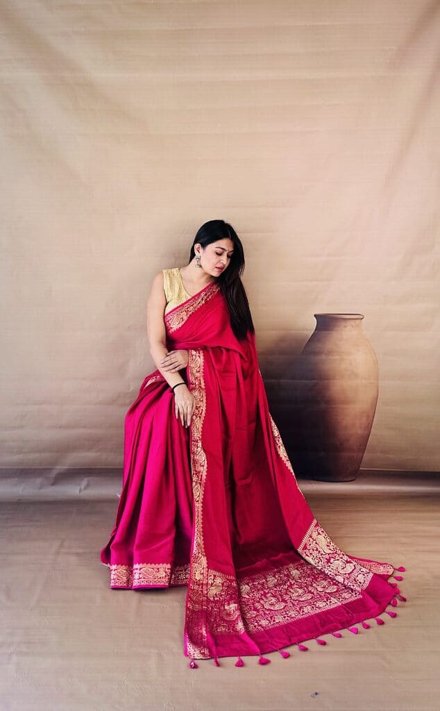 Feel graceful with this Dola Silk Nakashi Pallu Saree, where timeless heritage meets a modern, fluid drape. Drenched in a rich crimson hue, the premium Dola silk fabric offers a luxurious, liquid-like sheen that falls perfectly against the silhouette, while the highlight remains the exquisite Nakashi gold-weave pallu with saree length beautiful border, finished with handcrafted tassels. Whether you’re attending a high-profile wedding or a festive gala, this saree promises a regally understated look that is as comfortable to wear as it is breathtaking to behold.