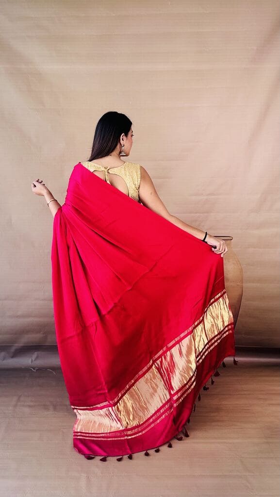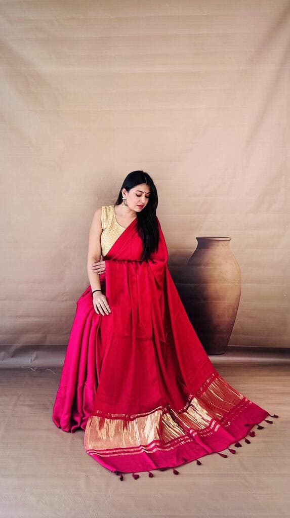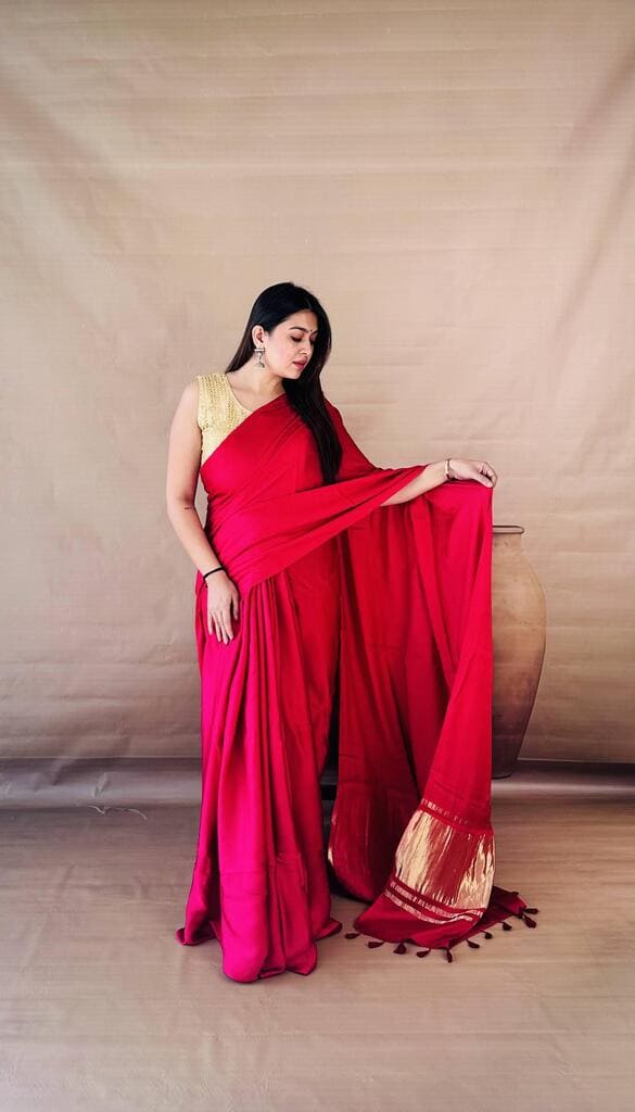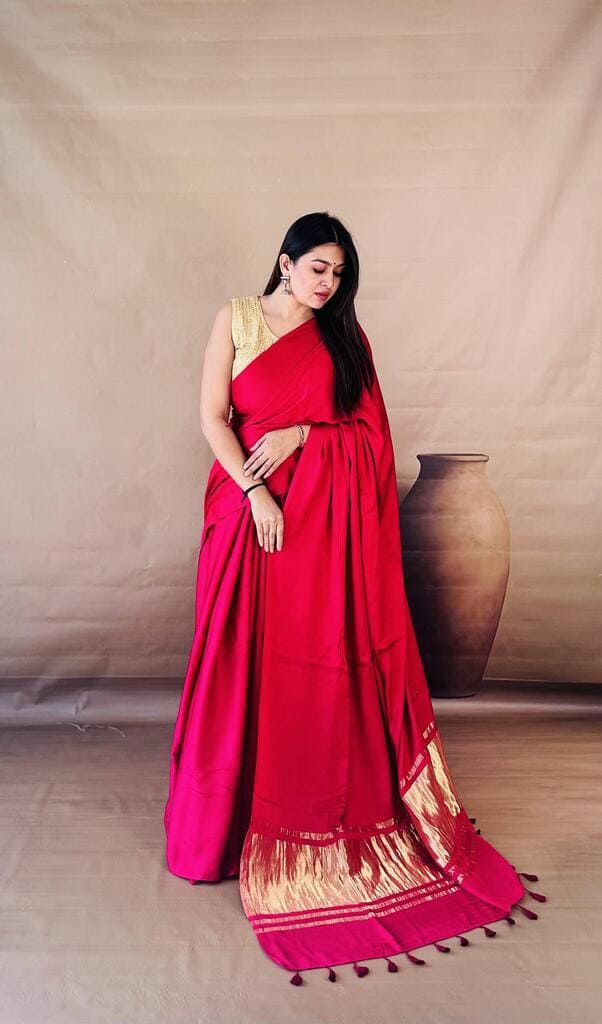 Embrace effortless opulence with this Dola Silk Nakashi Pallu Saree, where timeless heritage meets a modern, fluid drape. Drenched in a rich crimson hue, the premium Dola silk fabric offers a luxurious, liquid-like sheen that falls perfectly against the silhouette, while the highlight remains the exquisite Nakashi gold-weave pallu finished with handcrafted tassels. Whether you’re attending a high-profile wedding or a festive gala, this saree promises a regally understated look that is as comfortable to wear as it is breathtaking to behold.