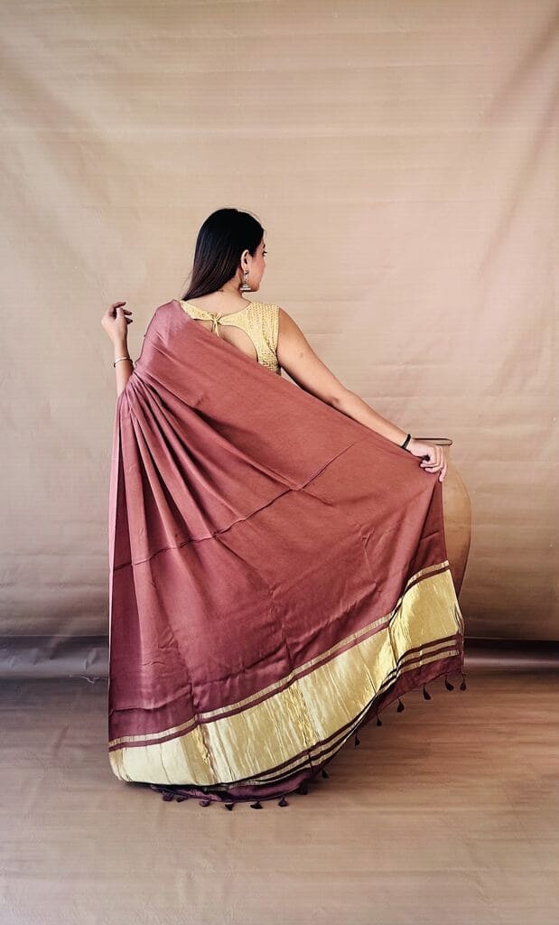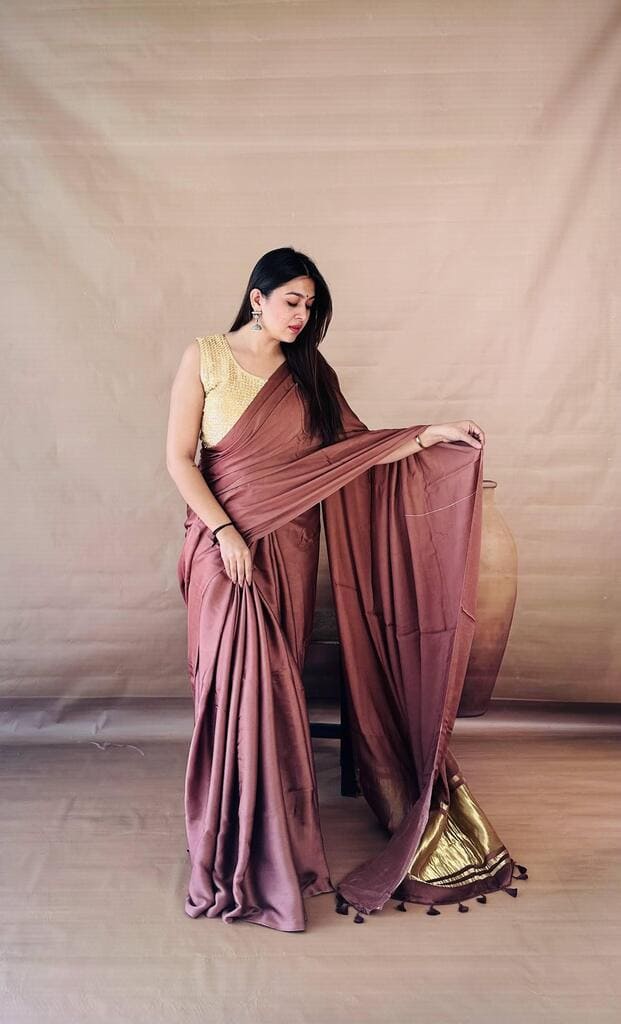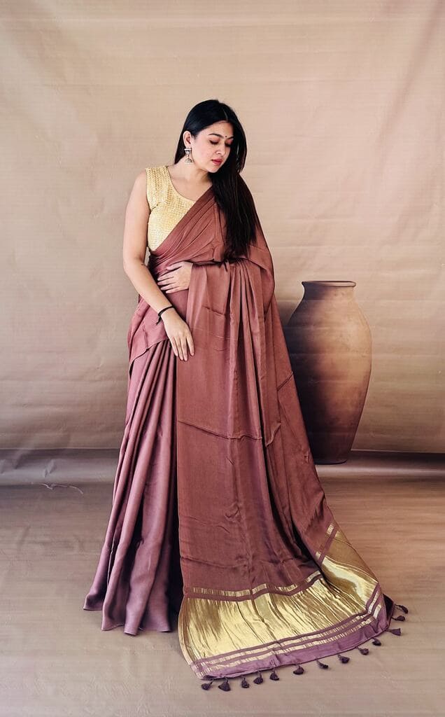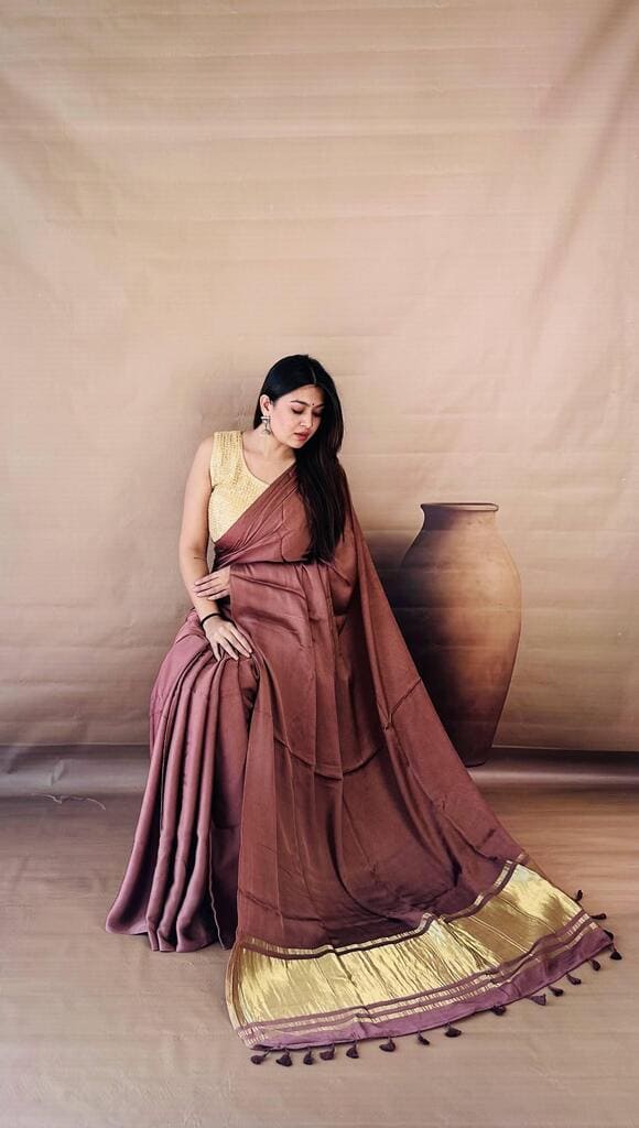 Embrace modern minimalism with this Dusty Mauve Dola Silk saree, a unique earthy shade that offers a sophisticated, understated glow. The fluid silk fabric is complemented by a wide gold tissue pallu border and matching tassels, creating a seamless blend of contemporary style and ethnic grace. Wear it with a casual over-the-shoulder drape for an effortless evening look that highlights the fabric’s natural luster and beautiful fall.