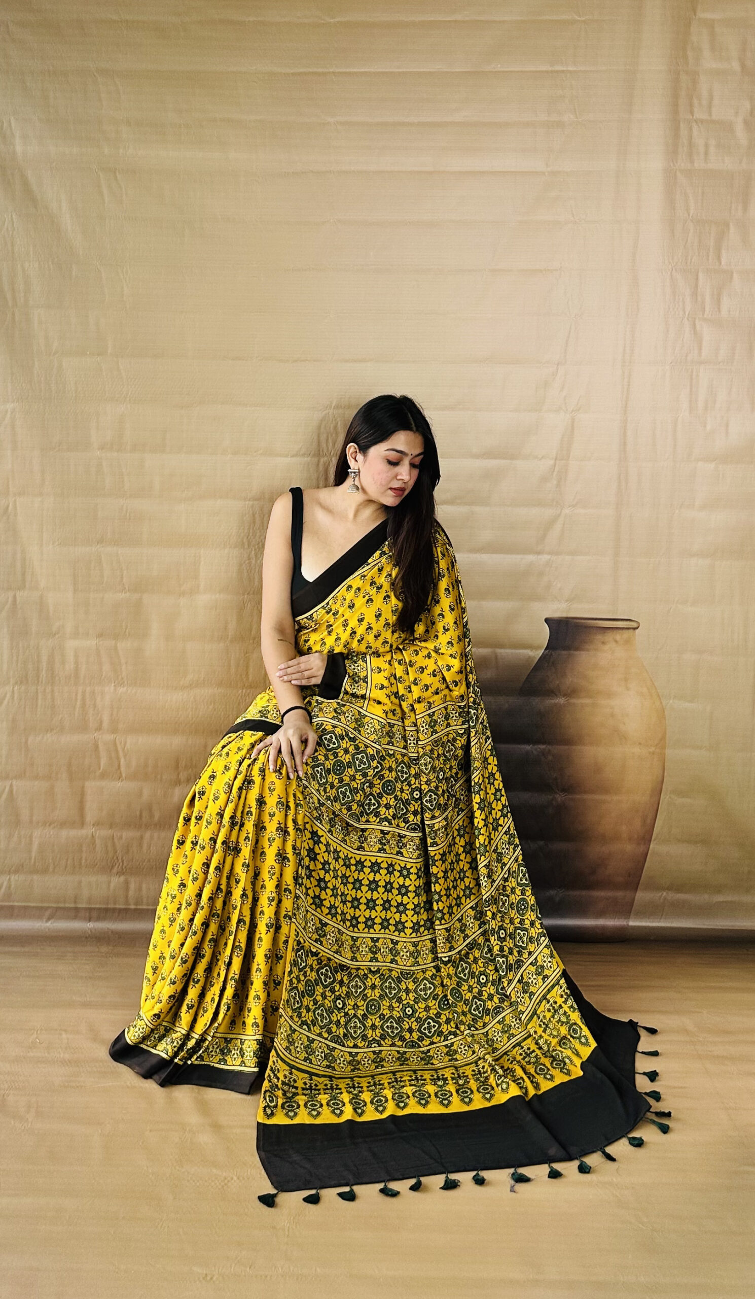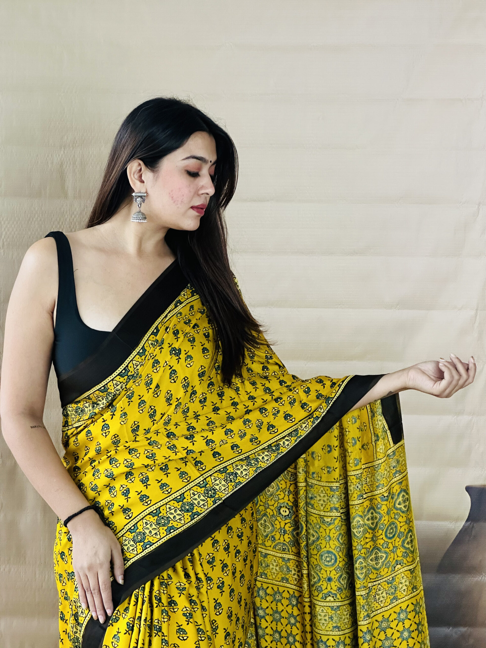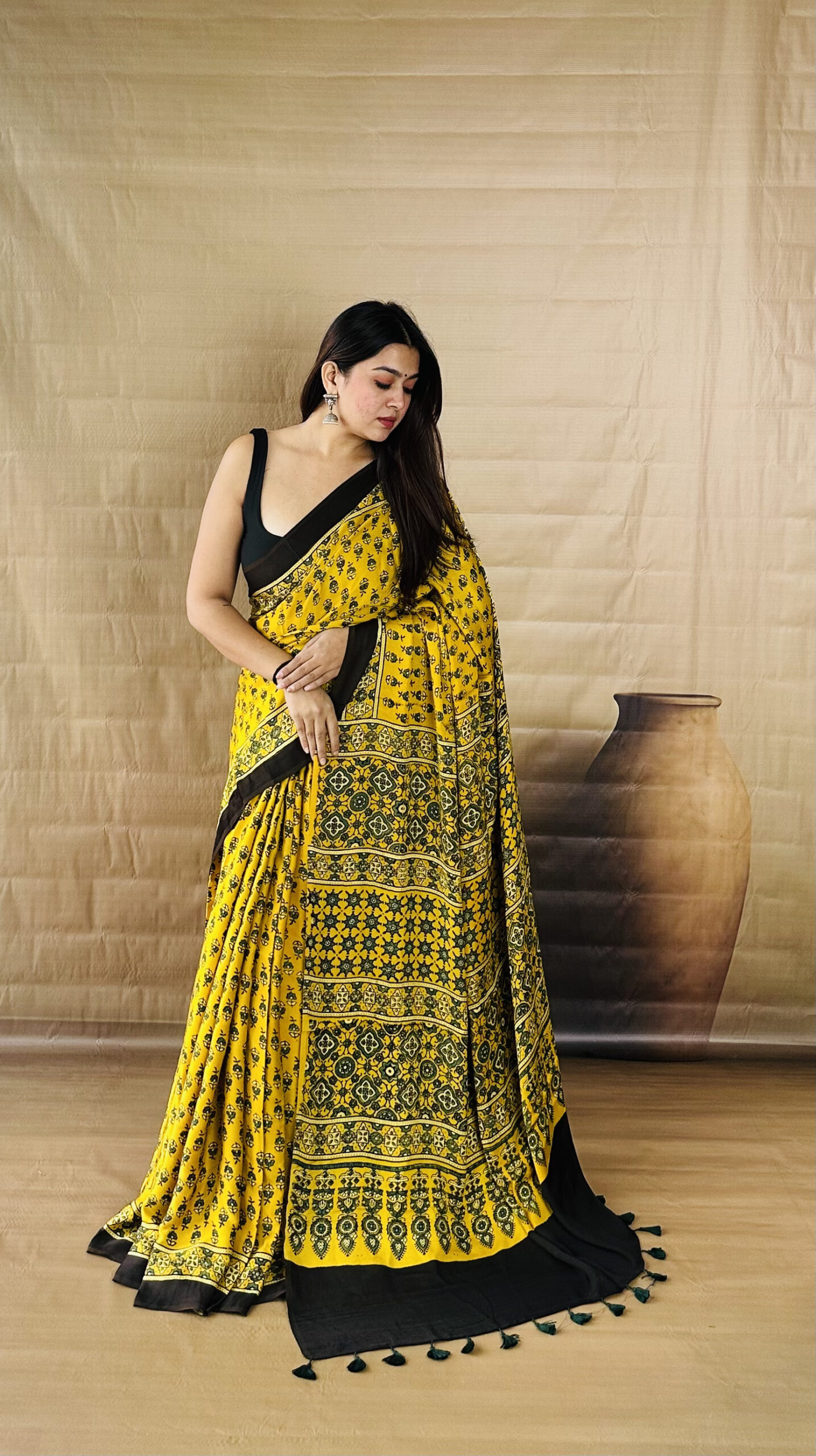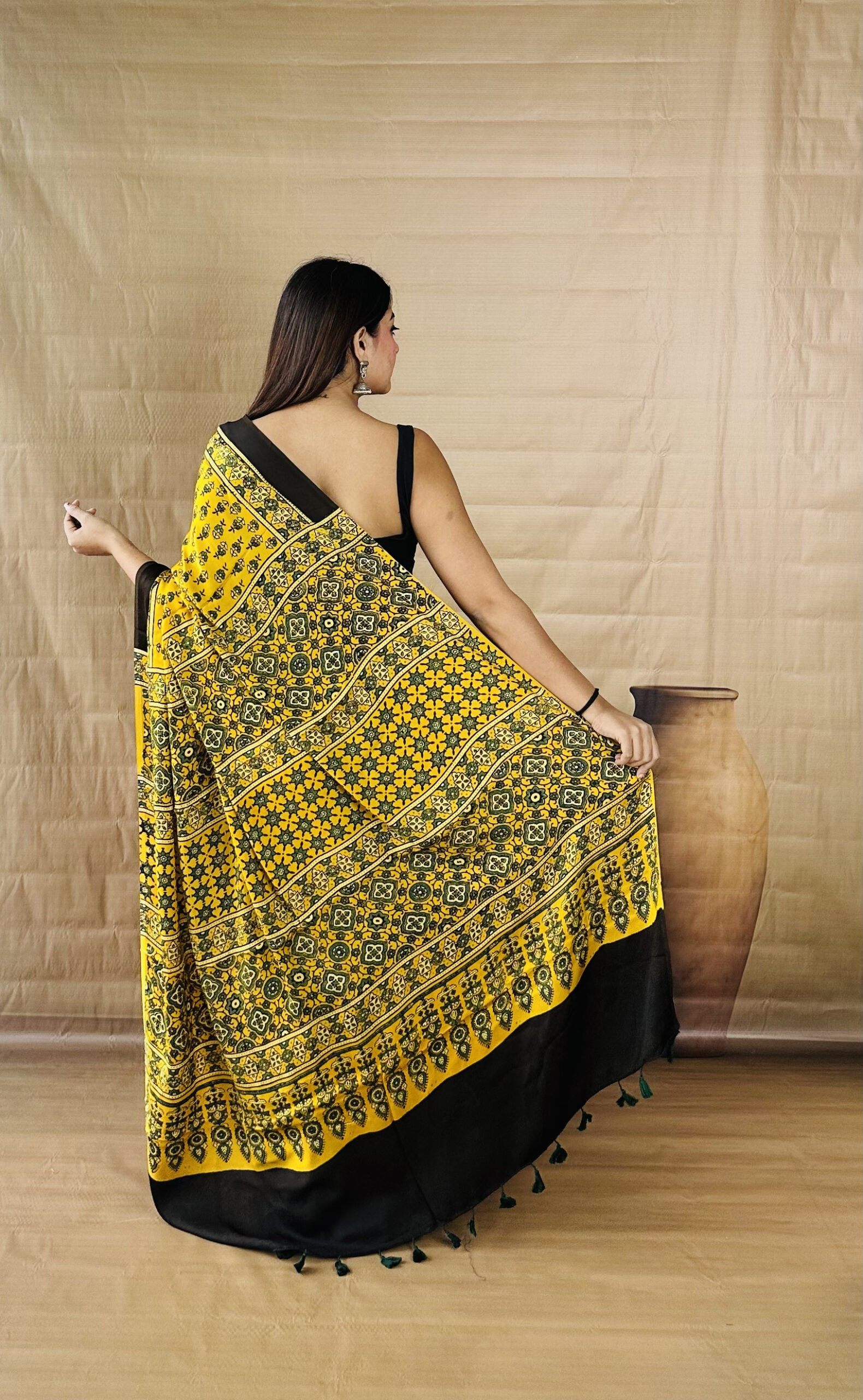 Warm Mustard tones highlight this pure Modal silk Ajarakh saree, finished with traditional hand block prints spread evenly across the body. The pallu carries layered patterns that add depth without overpowering the look, while the fabric remains soft and comfortable with a smooth fall. A plain blouse in Black or Deep Green pairs well with the contrast, and minimal Silver jewelry keeps the styling balanced.