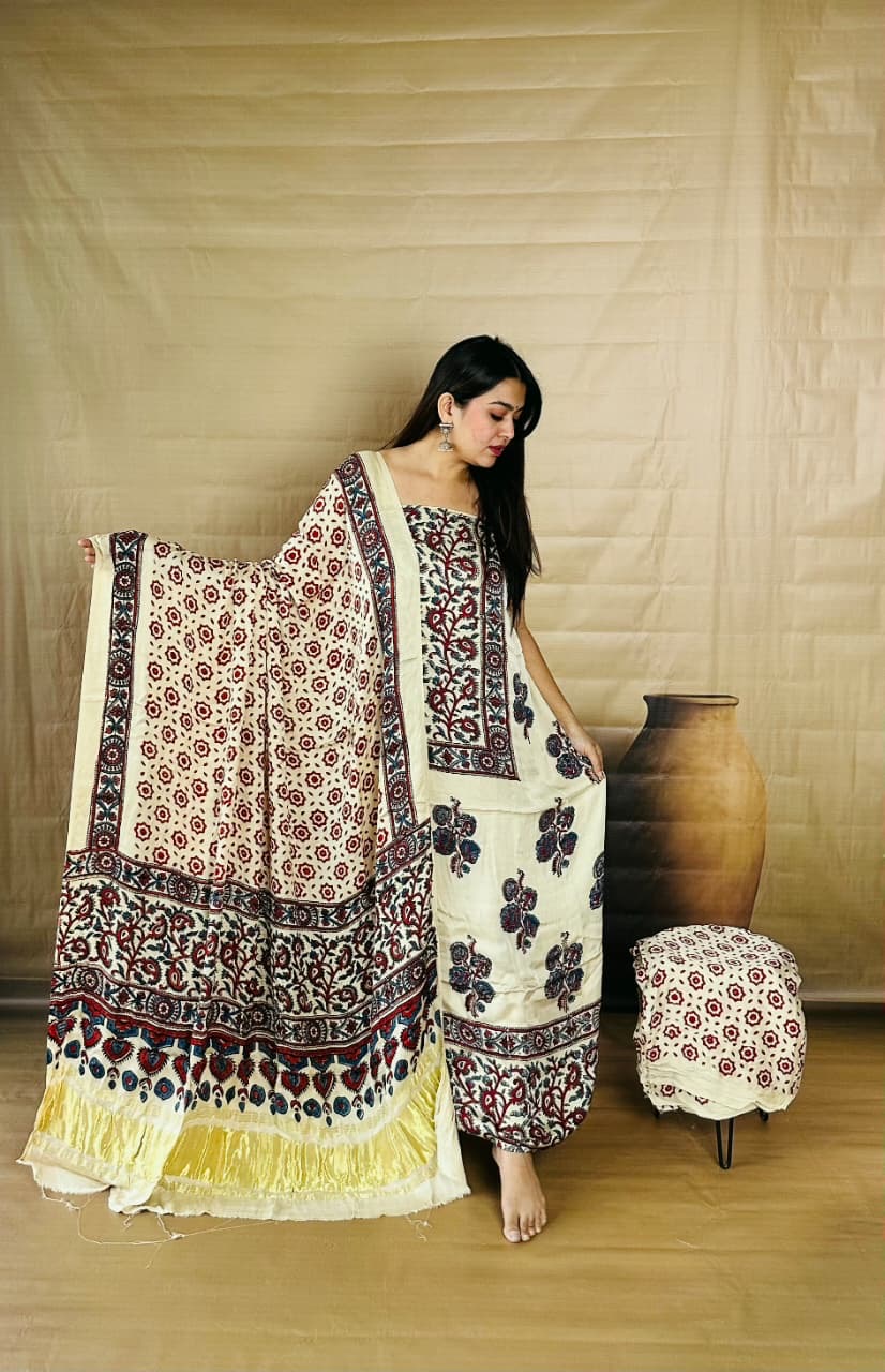 Elevate your elegance with this stunning off-white Modal Silk Dress material, designed to offer a perfect blend of softness, charm and effortless drape. The top features beautiful big floral prints that add a bold yet graceful statement, making the outfit instantly eye-catching without being overpowering. Complementing the top is a lightweight dupatta adorned with delicate small prints, adding balance and sophistication to the overall look.