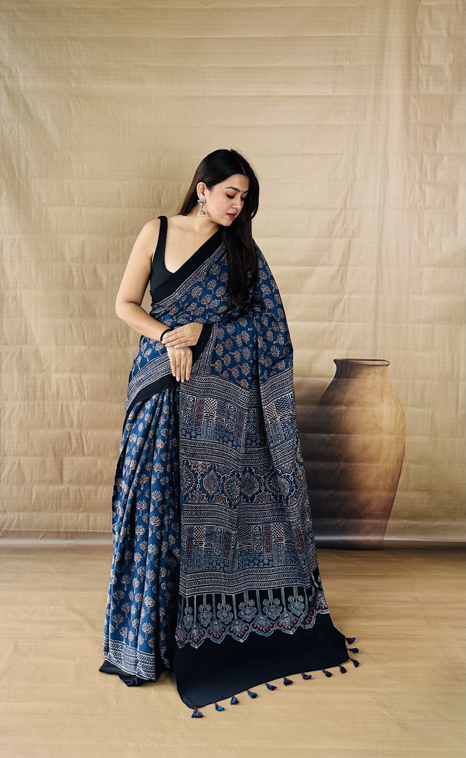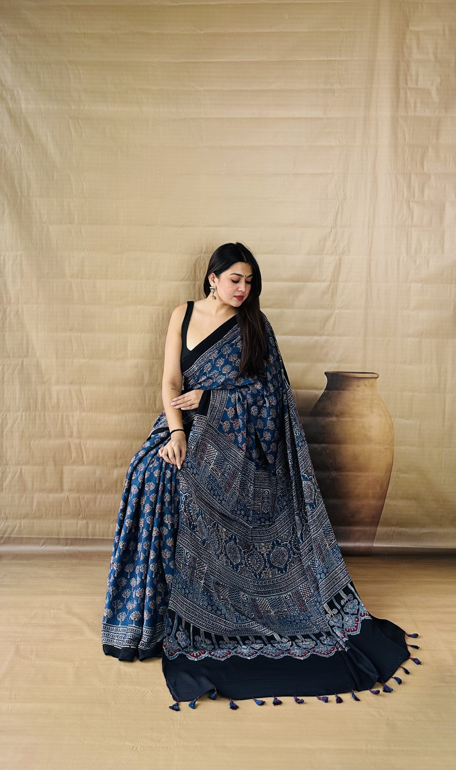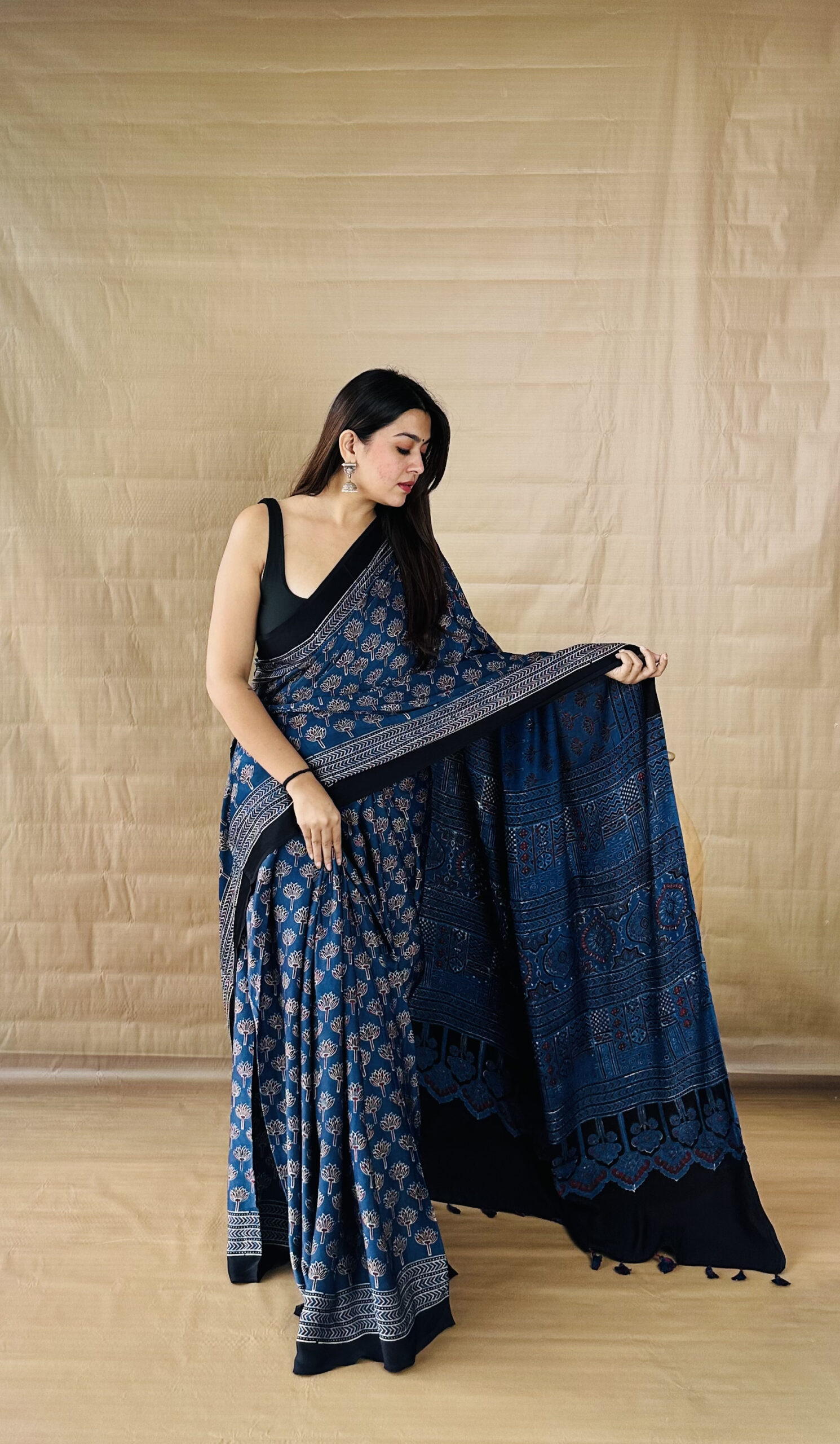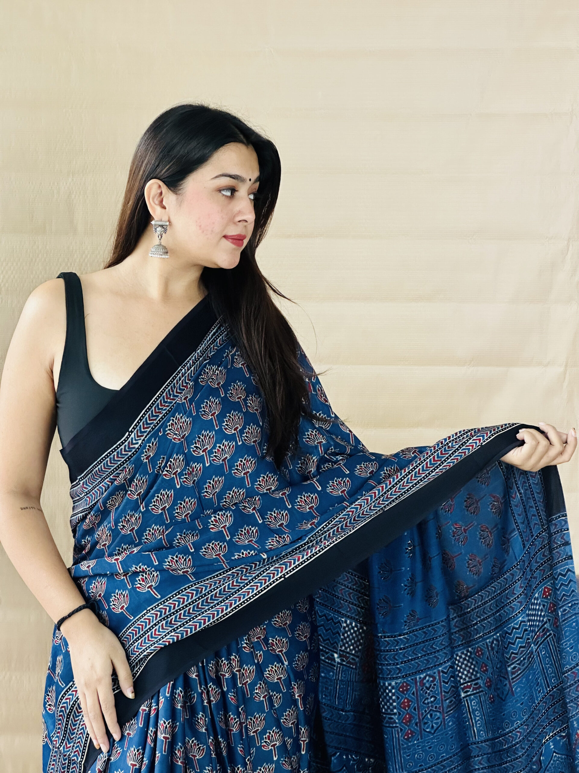 Royal Navy Blue Lotus Print- Ajrakh Modal Silk Saree