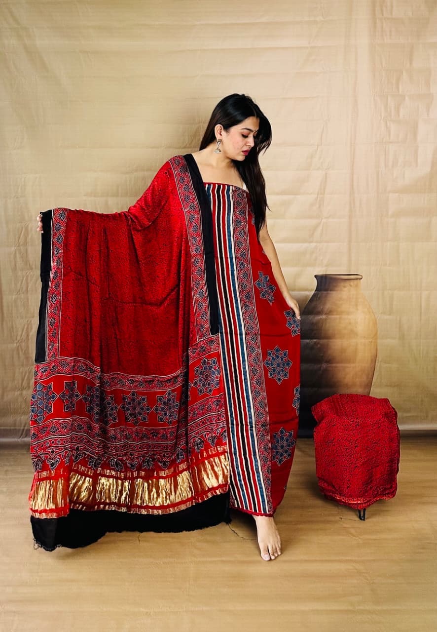 A smooth, lightweight Modal fabric in Rich Scarlet Red shade, styled with classic Ajarakh motifs and bold striped details on bodice area and beautifully framed border on drape. The material drapes beautifully, offering a soft feel on the skin. The floral blocks, contrast borders and coordinated patterns gives it a refined, handcrafted charm. Each section of the set harmonizes beautifully, giving your stitched outfit a refined and luxurious presence.