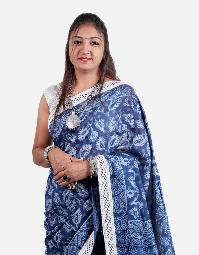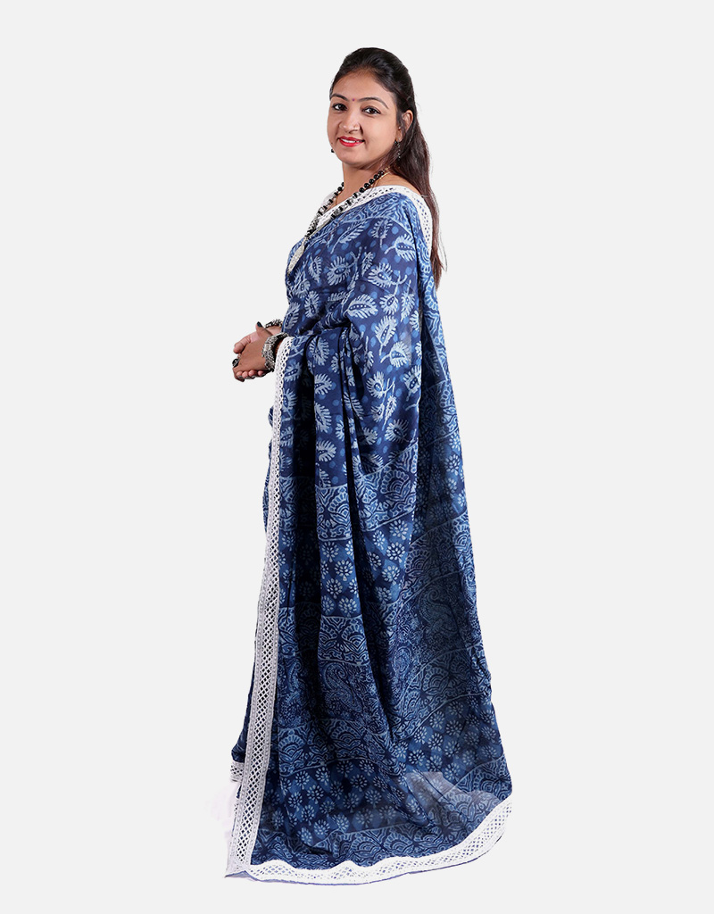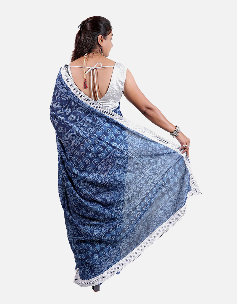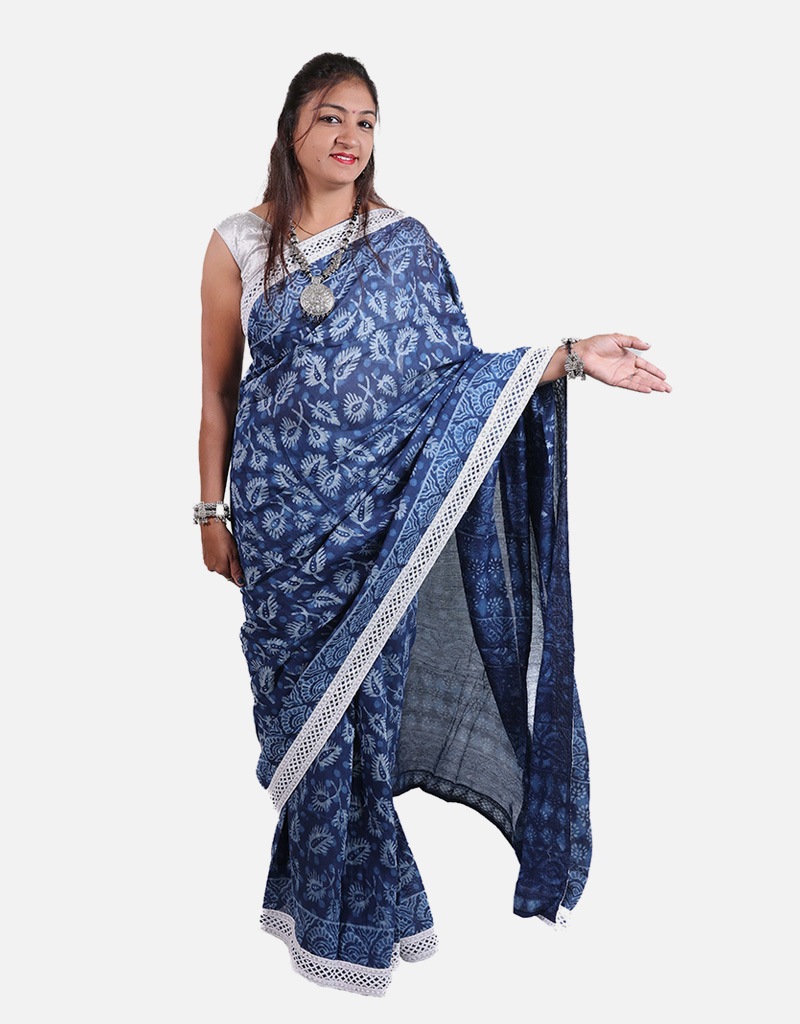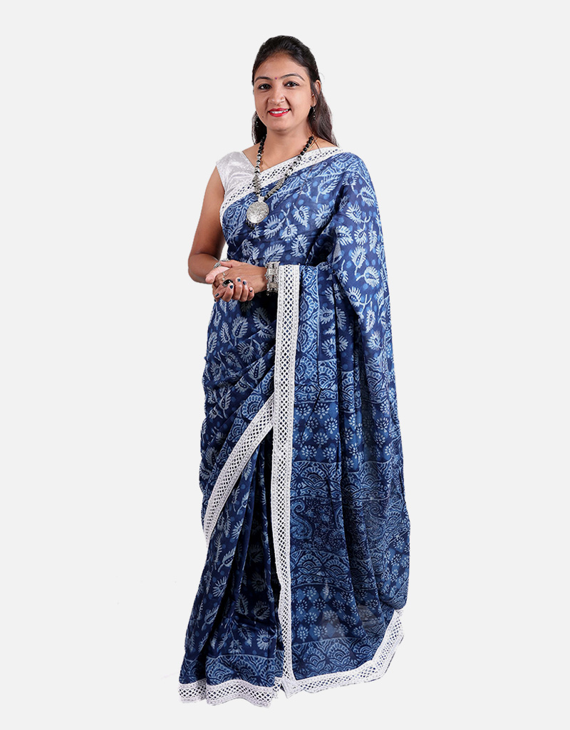 Immerse into the traditional beauty of this soft cotton saree. This Indigo collection reminds me of summer vacation in the village, where everyone is dressed up in beautiful soft cotton clothes for their comfort. We are very much obliged to bring you the Indigo collection from the Tarapur Nandana prints. Indigo saree with the Wide Chicken border.