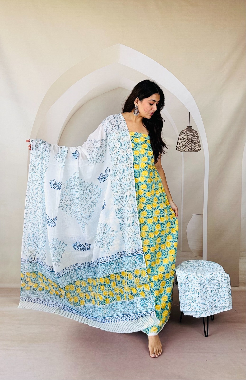 Pistachio- green dress, adorned with yellow rose motifs, is beautifully paired with a blue print dupatta, creating a refreshing and graceful ensemble that highlights the subtle charm of traditional craftsmanship. This Pistachio Soft Cotton dress is perfect to get you desire look with Matt Minakari Golden Jhumkas with statement long necklace.